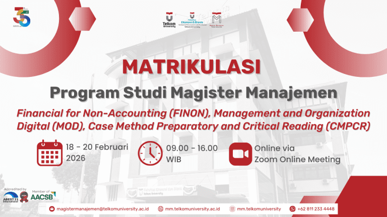 Program Studi Magister Manajemen Telkom University telah mengadakan kegitan Matrikulasi Semester Genap Tahun Ajaran 2025/2026 selama tiga hari yaitu pada tanggal 18-20 Februari 2026. Kegiatan Matrikulasi ini dilaksanakan secara daring melalui Zoom Online Meeting. Kegiatan Matrikulasi ini terdiri dari tiga mata kuliah yaitu…