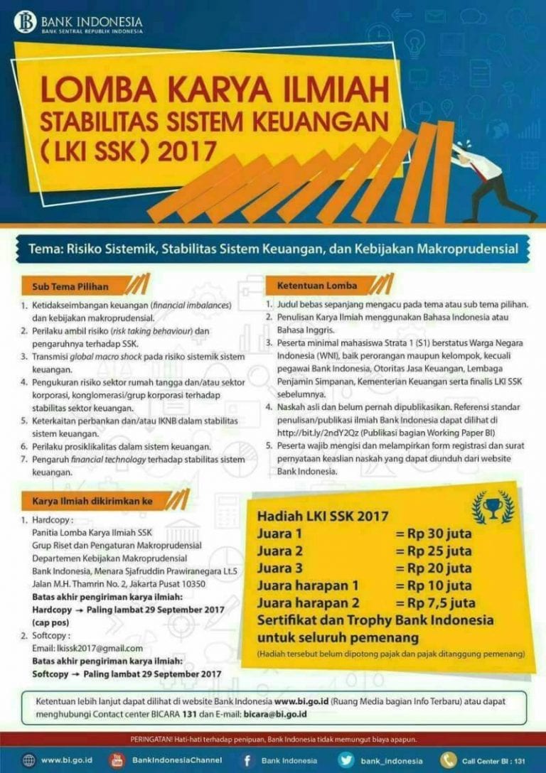 1. Lomba Karya Ilmiah dari Bank BI 2017, Hadiah 92.5 Jt, DL 29 Sepetember 2017, selengkapnya 2. Lomba Menulis Artikel Jurnalistik 2017 dari Kementrian Keuangan, DL 3 Mei 2017, selengkapnya 3. Lomba Foto Pendidikan dan Kebudayaan 2017 (Hadiah…
