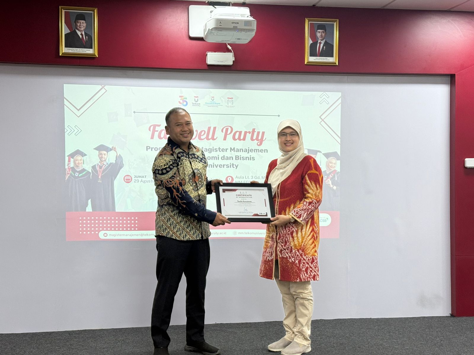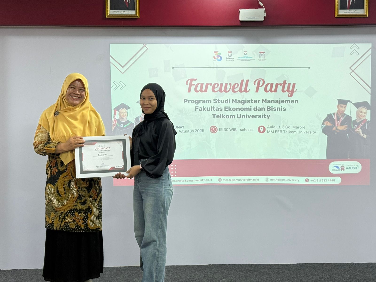 Jumat (29/8) Magister Manajemen Telkom University melaksanakan Farewell Party bagi Wisudawan periode Agustus 2025. Pada wisuda periode bulan Agustus 2025 ini, wisudawan dari Program Studi Magister Manajemen berjumlah 29 mahasiswa. Kegiatan ini berlangsung di Aula Lt.3 Gedung Marore Telkom University dan dihadiri oleh Dekan dan Wakil Dekan I Fakultas Ekonomi dan Bisnis Telkom University yaitu Prof. Dr. Farida Titik Kristanti dan Dr. Irni Yunita, Ketua Program Studi Magister Manajemen yaitu Puspita Wulansari, Ph.D., beserta jajaran dosen Magister Manajemen Telkom University.