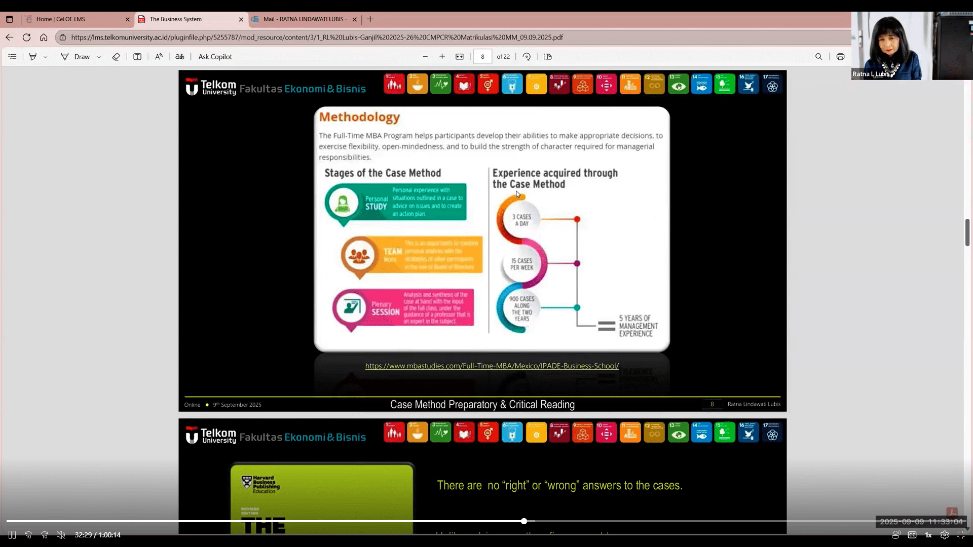 - Selasa, 9 September 2025: mata kuliah Case Method and Preparation for Critical Reading (CMPCR) yang diampu oleh Dr. Ir. Ratna L. Lubis, M.M.